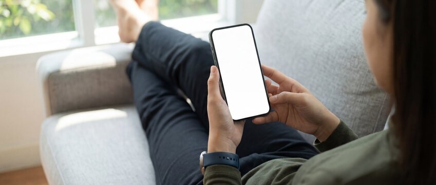 Cropped shot of woman holding smartphone with blank white screen while resting on couch at home