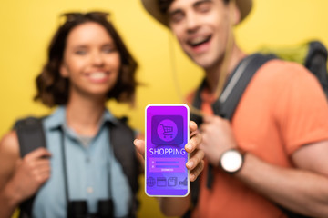 selective focus of cheerful woman showing smartphone with shopping app while standing near smiling man on yellow background