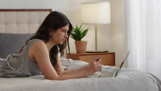 Attractive young woman is lying on the bed and looking at something on a laptop. A beautiful brunette spends her weekend morning watching TV shows on her laptop.