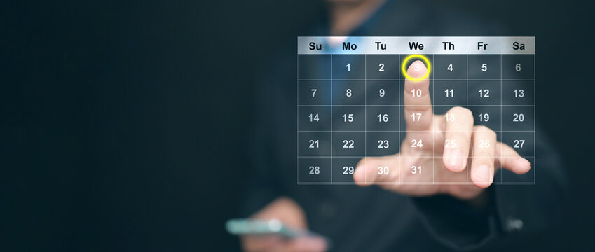 Calendar date event reminder for meeting schedule or appointment. Work deadline mark. Weekly plan, important business date concept. Businessman hand circle mark on calendar.