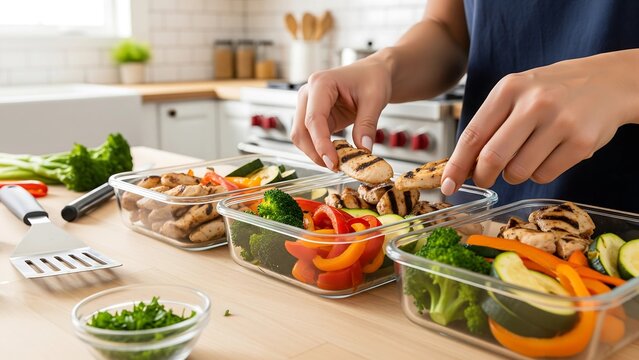 Hands preparing healthy meal prep containers with roasted vegetables and chicken in bright modern kitchen, lifestyle concept for healthy cooking and nutrition planning.
