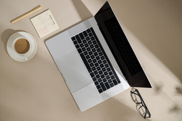 A minimalist workspace with a laptop, coffee, planner, and glasses