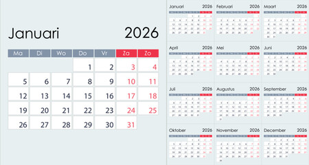 Clean Minimalist 2026 Yearly Calendar Grid Layout, on Dutch language