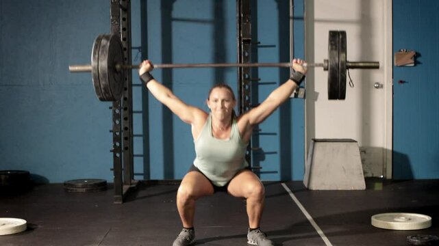 A weightlifter mid-lift, hoisting a heavy barbell above their head in a dramatic gym setting with chalk dust flying