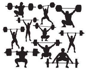 Set of weightlifting silhouette. Male and female weight lifter athlete in different poses.