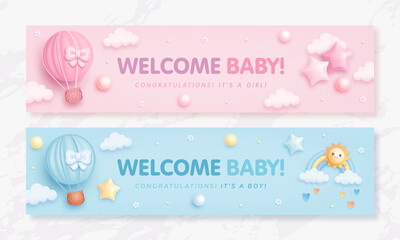 Set of baby shower invitation with cartoon hot air balloon, rainbow, sun, balloons and clouds on blue and pink background. It's a boy. It's a girl. Vector illustration