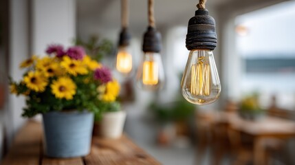 A beautifully arranged scene showcasing hanging lights over flowers in a pot, creating a warm and cozy atmosphere, ideal for cafes and intimate settings.