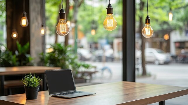 Cozy cafe interior with wooden table, potted plant, and warm lighting, ideal for urban dining and relaxation