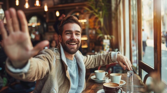 Smiling barista offering coffee in cozy cafe setting