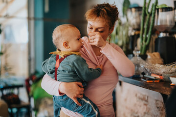 Hand holding smartphone with blank screen in cozy cafe - Generative AI