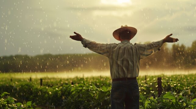A farmer in the fields, welcoming the rain with open arms, the downpour vital to the crops, highlighting the symbiotic relationship between weather and agriculture.