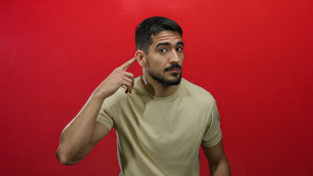 Young caucasian man smiling cheerfully pointing with forefinger away
