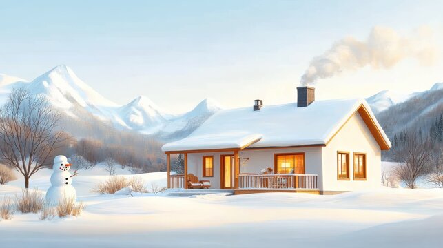 A quaint wooden cabin with a welcoming porch is set in a snowy landscape, accompanied by a cheerful snowman, all under the backdrop of stunning mountains and blue sky.