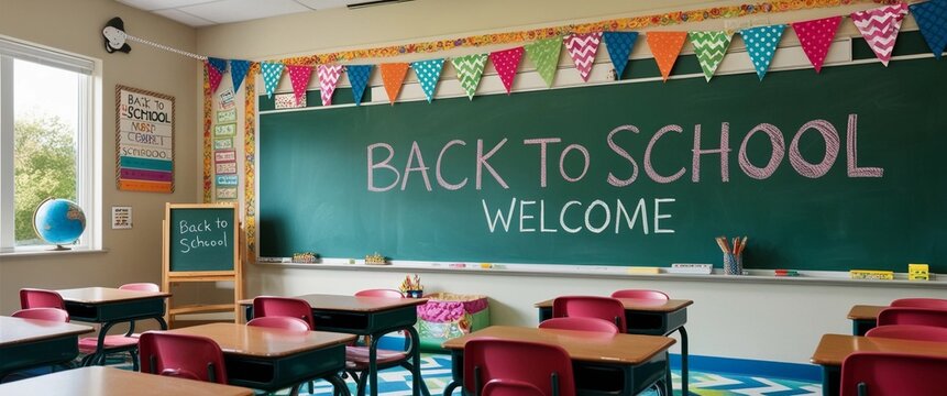 Classroom Welcome, a vibrant classroom scene with a welcoming chalkboard message and decorated walls