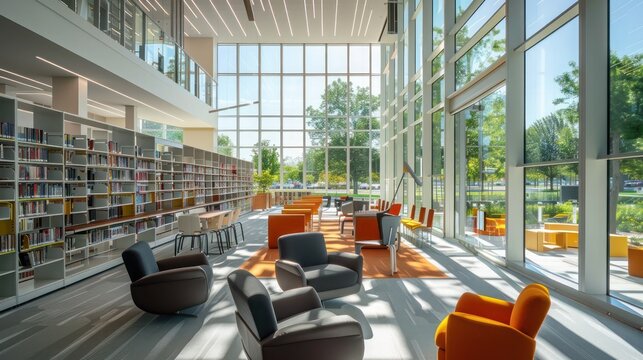 Modern office reception area with sleek design, minimal furniture, and large windows offering natural light.