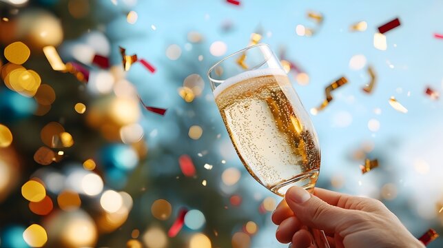 Champagne glasses raised in a toast to welcome the new year at a glamorous sophisticated party  Elegant sparkling decor and festive atmosphere for a special celebratory occasion