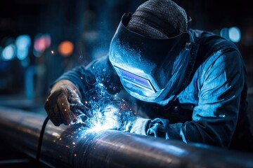 A skilled worker, clad in robust protective gear including a dark welding helmet and durable gloves, is captured in intense focus while performing arc welding on a large metal pipe. Brilliant blue and