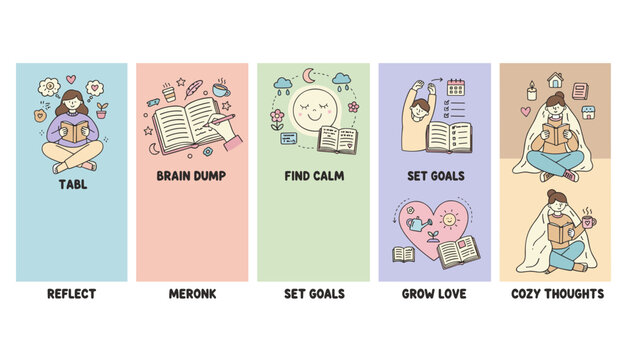 Cute illustration panels showing selfcare practices like reading journaling goal setting and finding calm