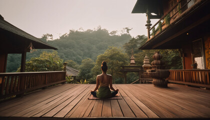 Woman yoga meditation sitting on terrace in nature, mental health care concept. AI generated