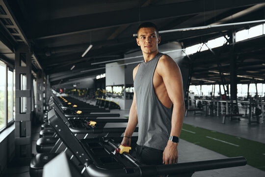 Fit man in gray tshirt preparing for running on treadmill in well equipped gym. Athlete guy looking away on jogging powder, working on health and fitness.
