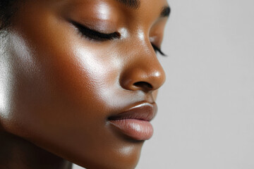 A close-up of a young African American woman with smooth skin and closed eyes, evoking a sense of calm and relaxation, emphasizing natural skincare
