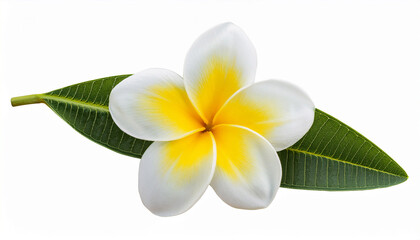 single blooming yellowish white plumeria or frangipani obtusa flower laos national flower isolated on white background with clipping path it is well known as champa in laos language