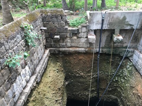Water well used by Stone boulders in flemish bond construction for agricultural or farming purpose and bucket rope facilities to lift