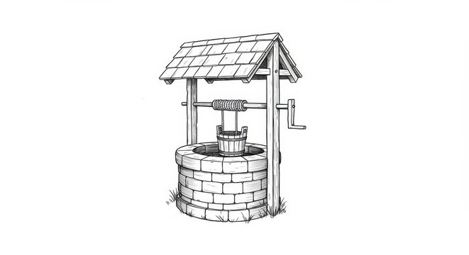 A drawing of an old-fashioned water well made of wood. It has a roof and a bucket.