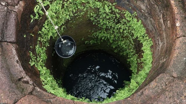 Looking up from the bottom of a deep stone well towards the bright sky, with a silhouette of a person standing at the edge.