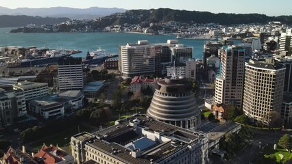 Spectacular aerial shot of Beehive, New Zealand Parliament building in the capital city of Wellington. Coastal cityscape