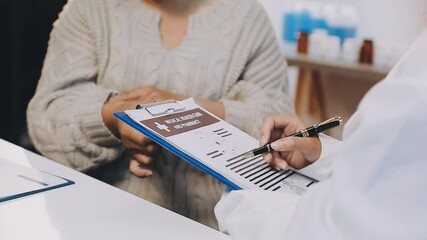Professional Asian female nutritionist giving nutritional counseling to female patient sitting at clinic table discussing diet, health goals, meal plans and strategies for long-term wellness