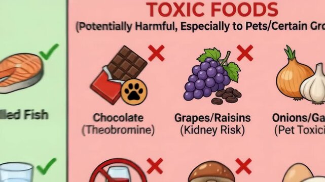 Informative graphic illustrating a distinction between safe food options like fruits, vegetables, and cooked meats, versus toxic foods such as chocolate, grapes, and alcohol harmful to health