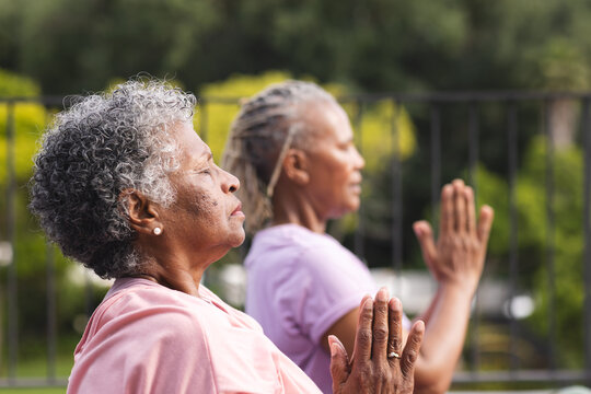 Senior African American woman and senior biracial woman practice yoga outdoors, both with grey hair