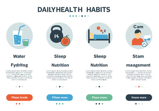 Colorful flat-style infographic illustrating four essential healthy habits—healthy eating, quality sleep, physical exercise, and proper hydration. Perfect for health awareness campaigns, wellness