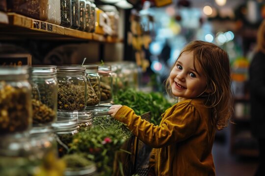 A young woman dressed in vibrant clothing stands confidently in front of a bustling market stall, proudly selling a variety of fresh, colorful plants and vegetables