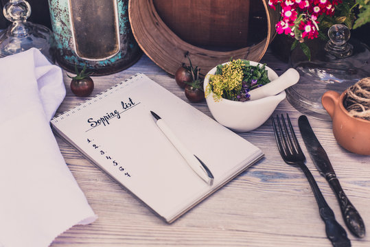 Shopping list on vintage wood background