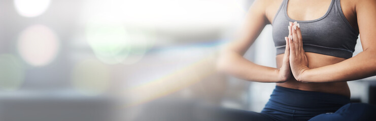 Banner, yoga and meditation, hands of woman in prayer pose for health and wellness in home. Spiritual peace, zen mindset and girl training on floor with commitment, bokeh and space for workout.