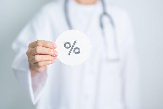 Woman show percentage symbol paper. Medical services, discount and promotion, Health, Diagnosis  and Medical concept