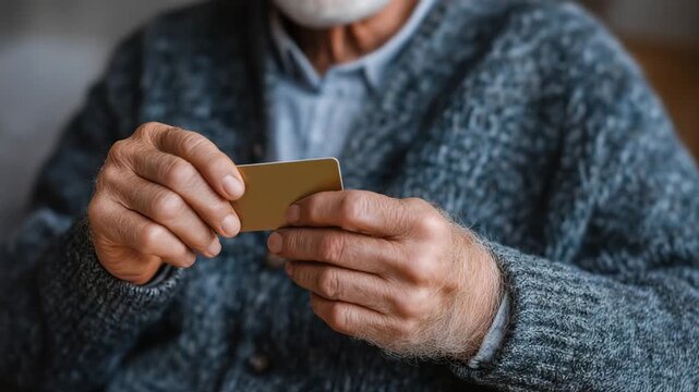A man is holding a credit card in his hand. He is wearing a blue sweater. Close up elderly hands holding generic health insurance card, medicaid warm authentic editorial style