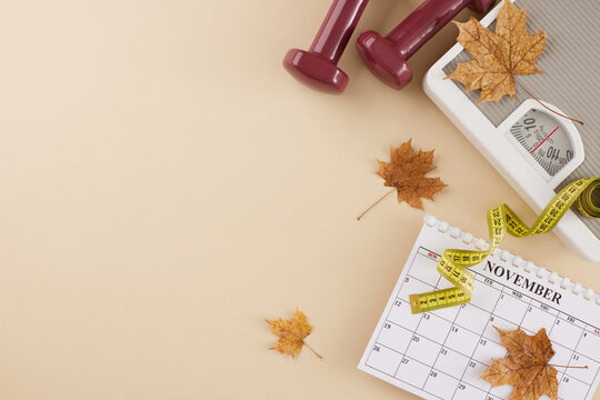 Autumnal body revamp. Top view composition of calendar, weight scale, tape measure, dumbbells, dry autumn leaves on pastel beige background with promo space
