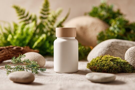 Elegant matte white supplement jar surrounded by natural greenery and stones for wellness display