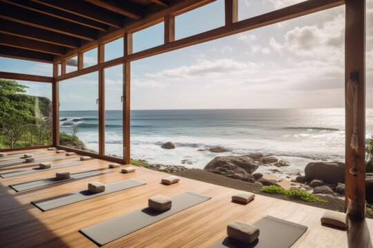 wellness retreats, with view of the ocean and beach, created with generative ai