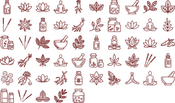 Holistic wellness icons featuring yoga, herbs, and acupuncture for natural healing