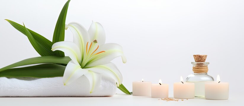 A serene wellness setting showcases a beautiful lily a towel a candle and an oil bottle on a white background providing ample copy space for your own use