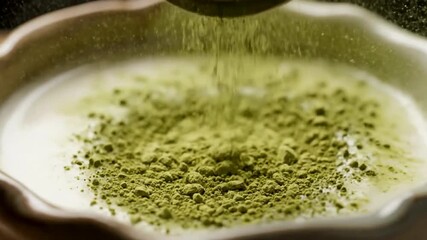 Green powder falling into a ceramic bowl, matcha preparation in progress, evokes a sense of calm and tradition, ideal for wellness themes