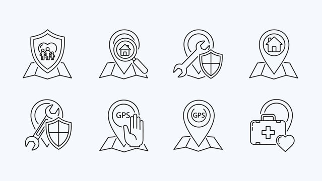 Elegant line art icon set depicting essential services and safety measures navigation application