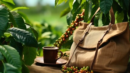 A rustic bag and a cup of coffee are set against lush coffee plants, highlighting the beauty of nature and the coffee culture, Ideal for lifestyle articles, café promotions, or eco-friendly themes,