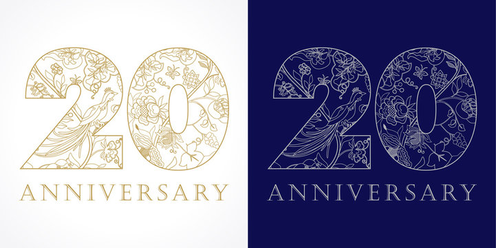 20 anniversary vintage logo. Template logo 20th anniversary in ethnic patterns and birds of paradise.