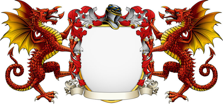 Welsh Dragons, symbol of Wales, coat of arms or crest family heraldry medieval heraldic knight shield with helmet and acanthus filigree scroll ornament in a vintage woodcut style.