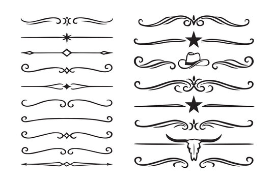 A large collection of old western design elements, borders and corners on old parchment paper.